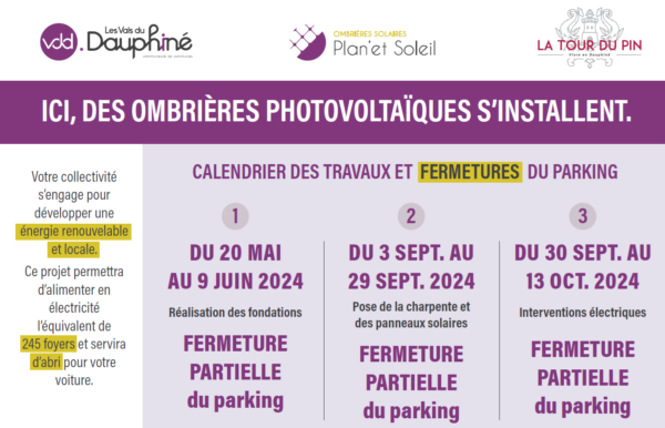 Les travaux d’ombrières photovoltaïques sur les parkings gare de Pont de Beauvoisin (parking situé au sud de la voie de chemin de fer, le parking nord n’étant pas concerné) et La Chevrotière à la Tour du Pin vont débuter prochainement. Ceux-ci vont entraîner la fermeture totale ou partielle des parkings durant les trois phases de travaux (réalisation des fondations, montage des structures, intervention électrique).