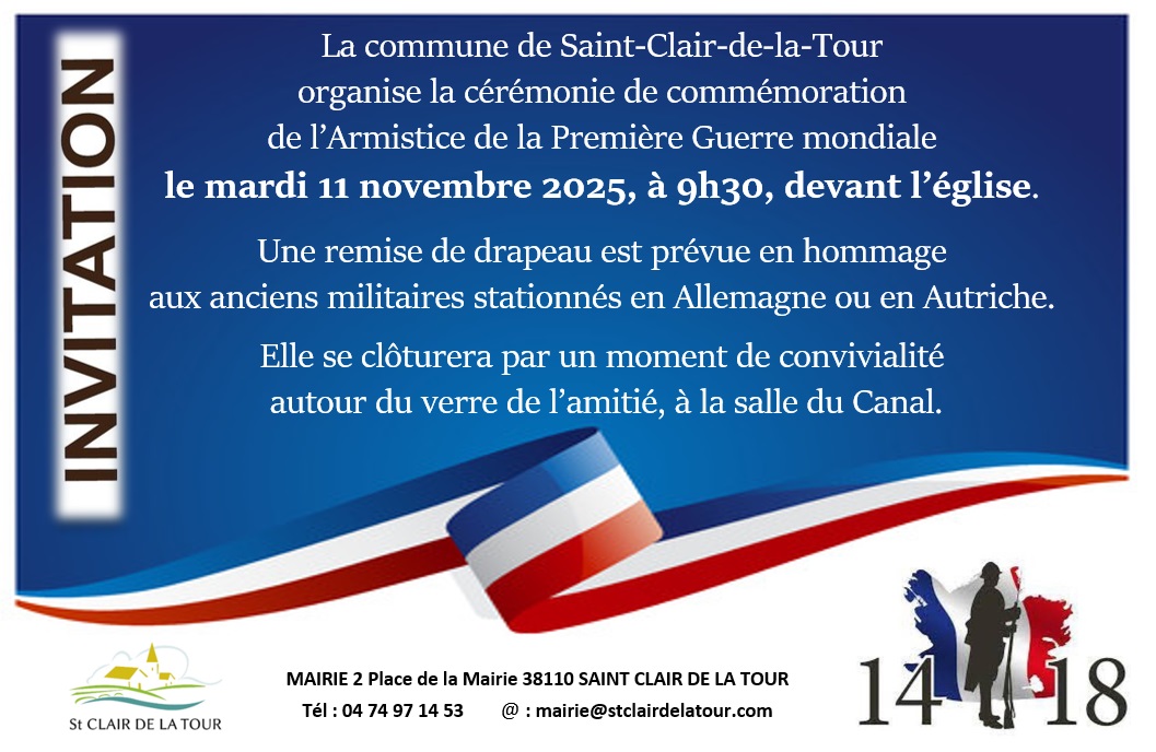 La commune de Saint-Clair-de-la-Tour vous convie à la cérémonie de commémoration de l’Armistice de la Guerre 1914-1918, le Mardi 11 novembre 2025, à 9h30, devant l’église.