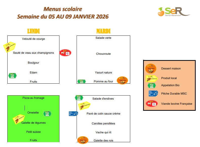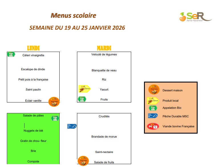 Nous tenons à vous informer que les menus de la cantine scolaire peuvent être amenés à changer en fonction des aléas d’approvisionnement, notamment pour les produits frais, bio ou locaux. Cette situation peut découler de divers facteurs, tels que les conditions météorologiques.