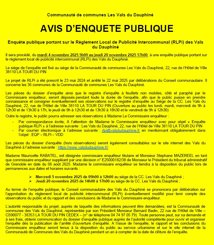 Il sera procédé, du mardi 4 novembre 2025 9h00 au jeudi 20 novembre 2025 17h00, à une enquête publique portant sur le règlement local de publicité intercommunal (RLPi) des Vals du Dauphiné.